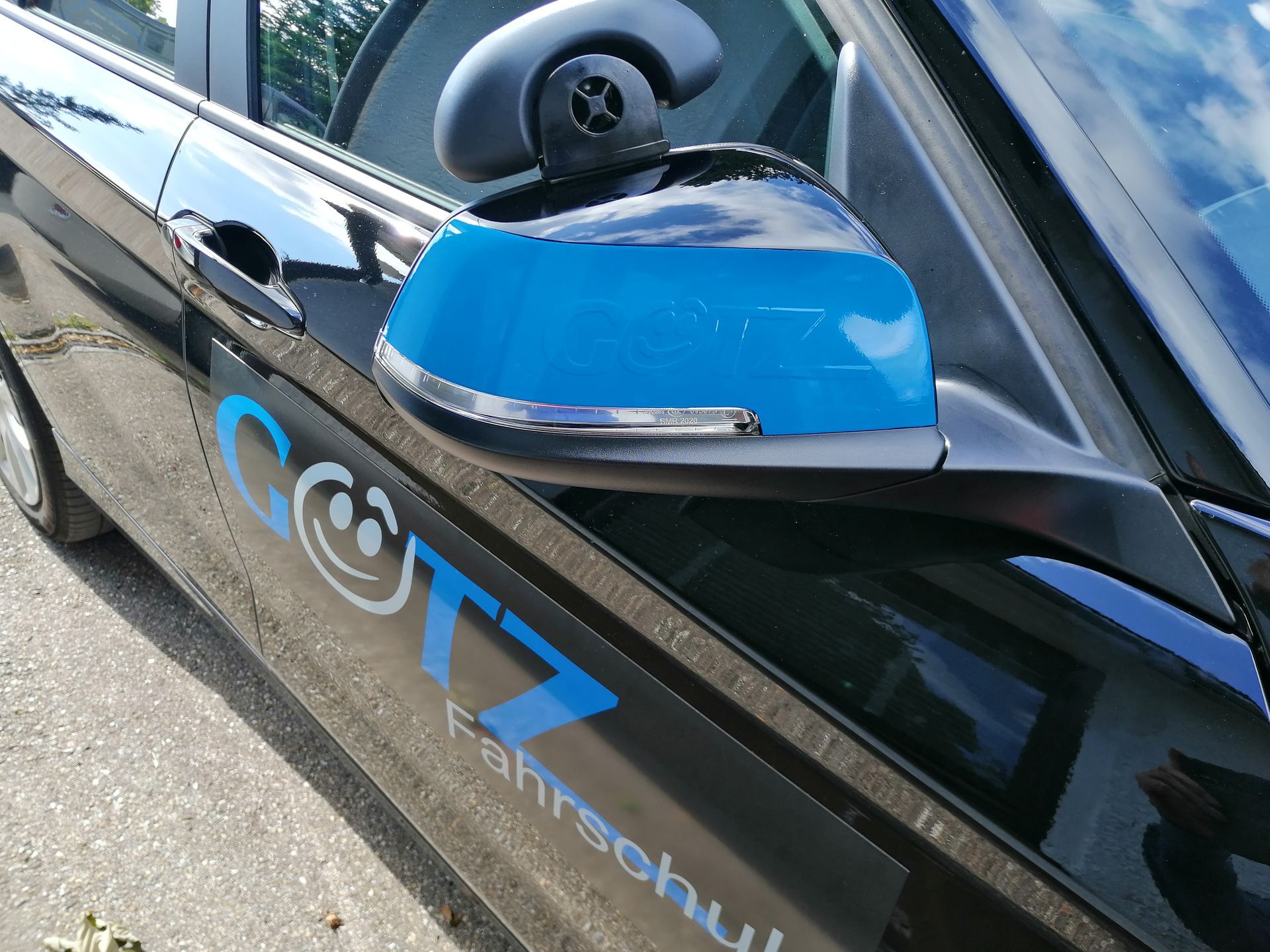 Fahrzeugbeschriftung mit kleinen Highlights. Spiegelkappen mit untenliegendem Logo-Zeichen.