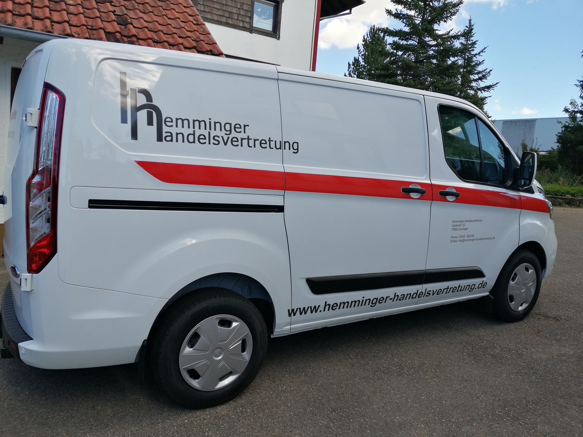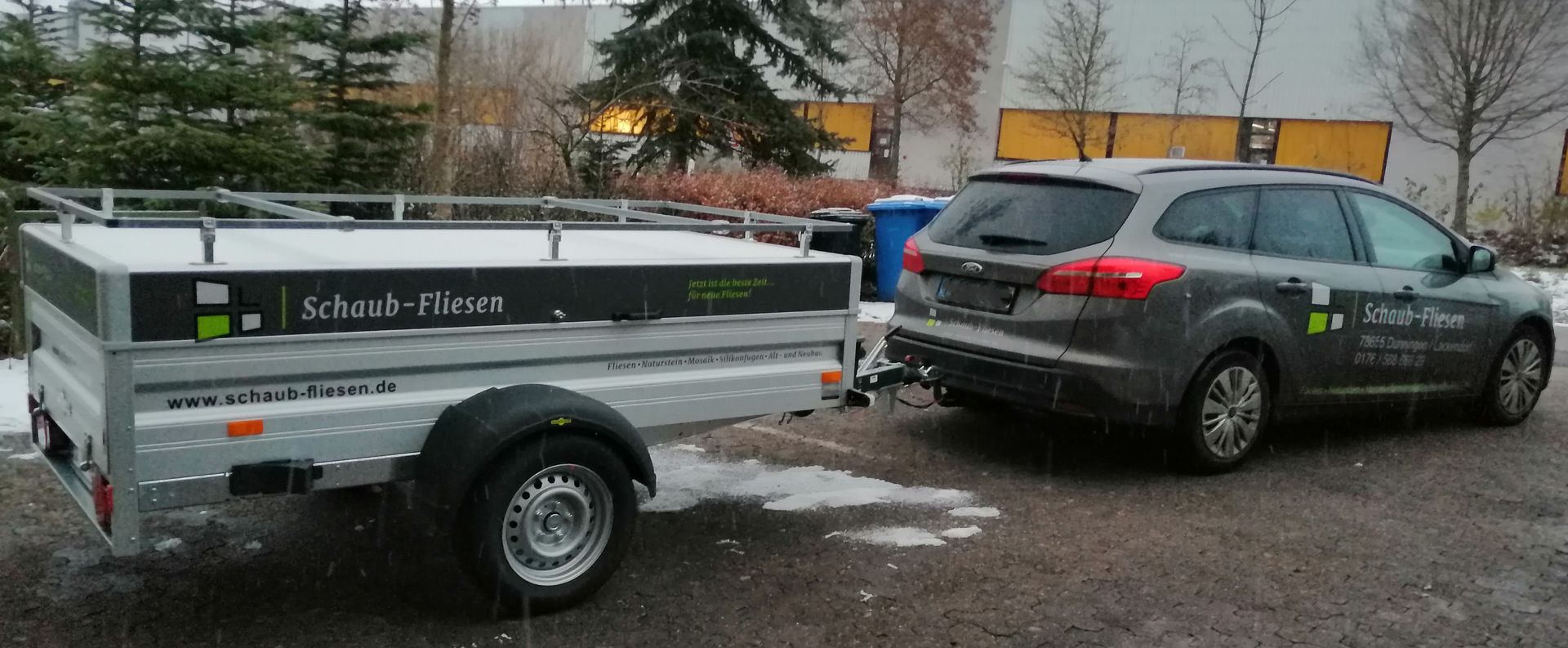 Logo und Schriftzüge sind aus verschiedenen Farbfolien zusammengesetzt. Mit dem Schneidplotter bearbeitet und auf Fahrzeug und Anhänger aufgebracht.