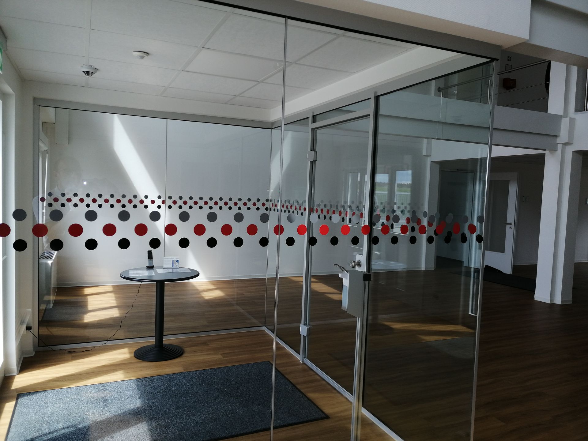In Eingangsbereich, Windfang, haben wir wieder mit Firmenfarben die drei Hauptgruppen mittels Kreise dargestellt. Zweck ist ein Auflaufen auf die Glasscheibe zu verhindern.
