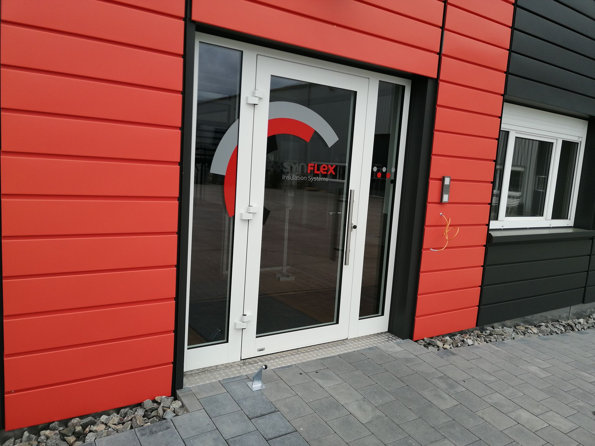 Unterschiedliche Längen der Etagen waren eine zusätzliche Herausforderung für das Motive. Die Firmenfarben haben wir mit eingearbeitet. Ebenso wurde die drei Bereiche der SynFlex Group berücksichtigt. Bedruckt und auch geplottet mit Firmen Logo, Schriftzügen und den drei symbolischen Streifen der Group.
